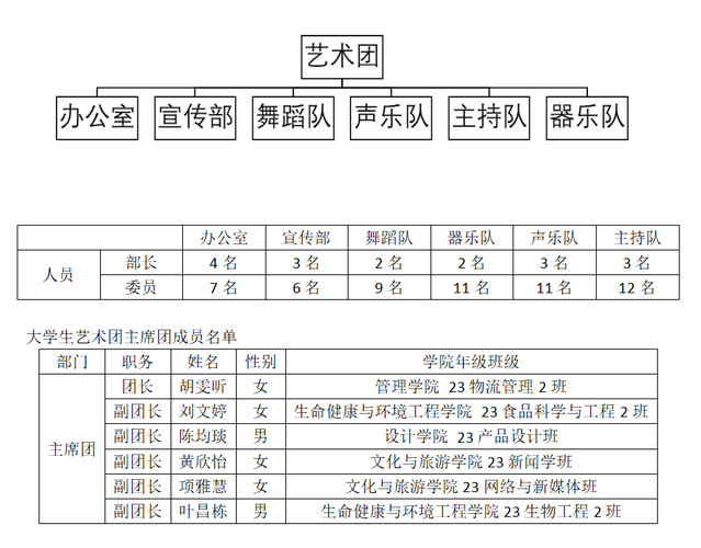 大学生艺术团由六个部门组成,分为表演部门和管理部门。其中,表演部门包括:主持队、舞蹈队、器乐队、声乐队;管理部门包括:办公室、宣传部。第二十一届大学生艺术团主席团成员共6人,部长加成员共73人,全团共79人。