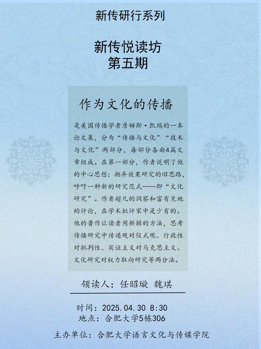 詹姆斯·凯瑞(James W. Carey)(1934-2006)是媒介理论家、批评家,以及美国文化研究的主要代表人物。他曾任伊利诺伊大学厄巴纳-香槟分校传播学院院长、哥伦比亚大学新闻学研究生院教授,并被誉为“美国本土的批判学者”。其著作有《作为文化的传播》《电视与新闻》《转变时代观念》。詹姆斯•凯瑞的传播学研究开始在20世纪50年代,他的思想深受杜威和芝加哥学派的影响,在拉扎斯菲尔德的效果研究模式盛行的背景下,他提出传播“仪式观”,开辟了传播学研究的又一途径。