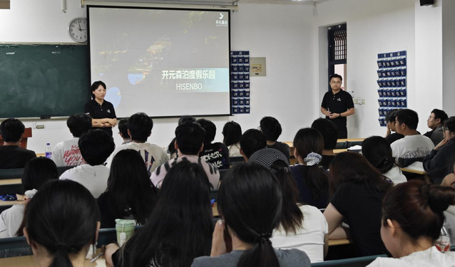 宣讲会伊始,播放了森泊度假乐园企业宣传片,生动展现了开元森泊将自然生态与度假体验完美融合的独特魅力,其“酒店+乐园”的一站式创新模式令同学们印象深刻。随后,开元森泊的人力资源负责人吴燕介绍了该企业的发展历程、核心文化以及在休闲度假领域的领先地位。讲解重点聚焦于面向在校生和应届毕业生的“森泊星计划”培养项目,该项目通过系统化的轮岗实践、资深导师的一对一指导和丰富的在岗培训,旨在帮助新人快速完成从学生到职业人的转变,成长为复合型文旅人才。