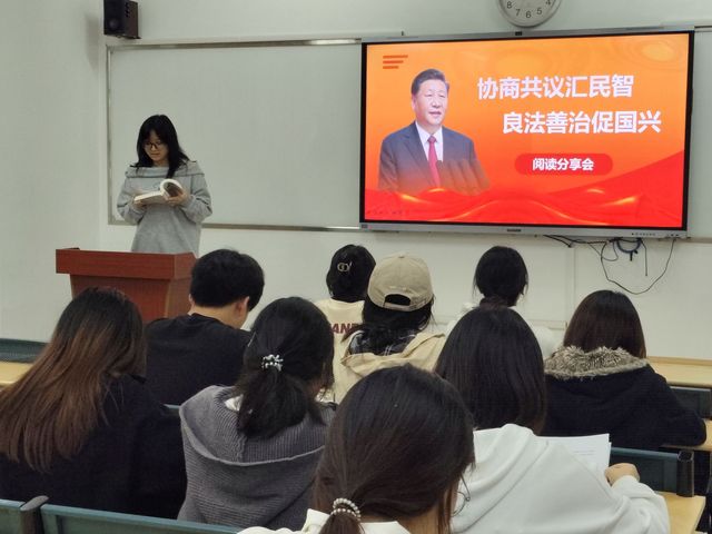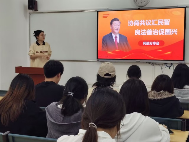 为深入学习贯彻习近平新时代中国特色社会主义思想,提高党员和入党积极分子的理论素养,文化与旅游学院学生第三党支部于10月16日组织开展了第十三期读书分享会。活动由支部党员廖盈盈主持,聚焦“协商共议汇民志,良法善治促国兴”主题,重点学习了《习近平谈治国理政(第五卷)》第六、第七章内容。三名党员和积极分子代表结合专业背景与个人思考作重点发言。