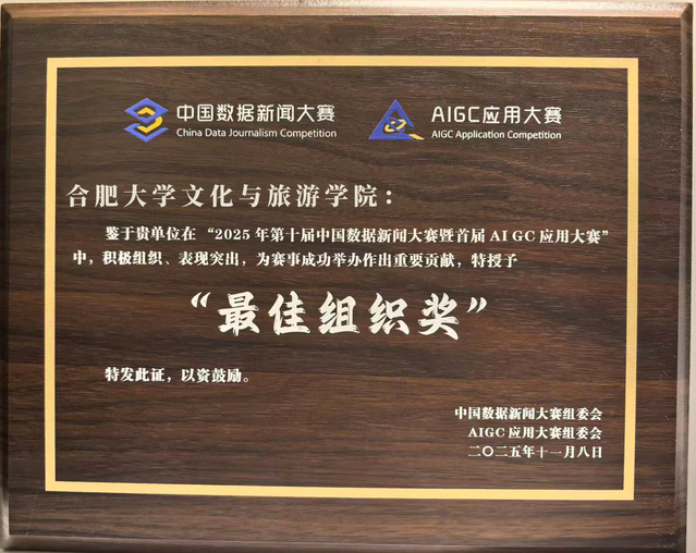 我校在本届大赛中喜获佳绩,充分彰显了合肥大学卓越新闻传播人才的培养成效。文化与旅游学院高度重视此次大赛的组织和指导工作,新闻传播学科参赛同学在选题策划、数据采集处理、可视化设计制作等各环节认真准备,指导教师全程悉心指导,有效提升了学生的创新思维和实践能力,提升了作品创作的专业水平。这些参赛作品敏锐捕捉热点话题、关注社会发展现实、传播优秀传统文化,将新闻传播实践与大数据挖掘分析、数据可视化呈现、AIGC技术应用相结合,充分体现了“新文科”特色。参赛选手通过此次大型比赛,既收获了成果、绽放了风采,也碰撞了智慧火花、提升了综合素质,为今后走向工作岗位打下了坚实基础。未来,文化与旅游学院将继续坚持以赛促学、以赛促教,秉持理论与实践相结合,积极落实“新文科”建设理念,不断推进智能媒体时代卓越新闻传播人才培养工作,为传媒行业发展及社会治理创新注入新生力量。