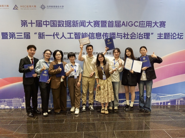 2025年11月8日,在第26个中国记者节到来之际,第十届中国数据新闻大赛暨首届AIGC应用大赛暨第三届“新一代人工智能信息传播与社会治理”主题论坛在北师香港浸会大学隆重举行,来自全国各地的传媒学者、业界专家、指导老师和参赛选手近1500人参加。合肥大学文化与旅游学院多支队伍入围全国总决赛,经过激烈角逐,最终斩获国家级一等奖2项、二等奖1项、三等奖3项、优秀奖1项,入围及获奖数量均位列安徽省内高校第一并在全国参赛高校中名列前茅,实现了历史性重大突破。合肥大学文化与旅游学院荣获“最佳组织奖”,张冰清老师、黄艳芬老师、唐元老师、王书川老师荣获“优秀指导教师奖”。我校入围全国总决赛的学生团队在王书川、林世华、许婧三位老师的带队指导下,赴广东珠海参赛。林世华老师担任决赛分赛场评委。