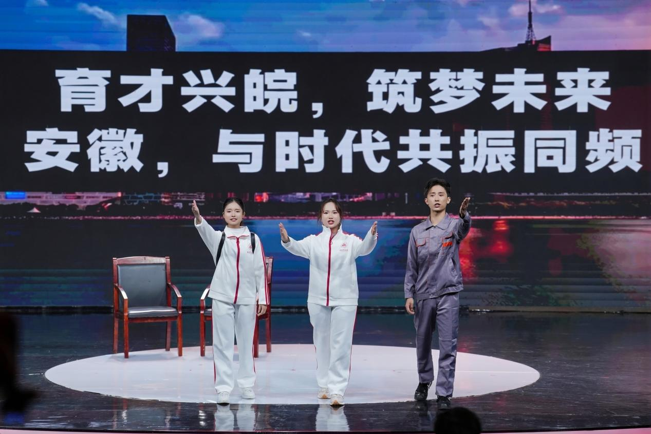 决赛设置徽风“艺”韵、“皖”物推荐、有缘千里来相“徽”三个环节,全方位考验参赛者的文化理解与表达能力。在徽风“艺”韵环节,黄妮芳与助演杜芷璇携手演绎安徽特色花鼓灯舞蹈,舞姿翩跹、韵味醇厚,生动诠释徽风皖韵的独特魅力,赢得现场阵阵掌声。“皖”物推荐环节中,她与助演侯义阳默契配合,精准描述并猜出三项安徽风物,尽显对安徽文化的深刻认知。核心环节有缘千里来相“徽”中,由黄妮芳主演、国际中文教育专硕点师生、新闻与传播专硕点学生共同创排的情景剧《合大・合拍・合未来》将比赛推向高潮。该剧以留学生视角切入,讲述泰国新生“北星”在柬埔寨学姐“妮妮”与中国学长“义阳”的帮助下,消除留学疑虑、读懂合肥大学办学理念与安徽发展机遇的故事。剧中通过课堂交流、实验室参观、产业分布图展示等场景,直观呈现学校紧扣“中部崛起”“制造强国”大政方针,主动对接安徽新能源汽车、智能装备等十大新兴产业,聚焦高素质应用型人才培养的办学实践,生动诠释了留学生与安徽、合肥、合大“双向奔赴、共同成长”的动人情怀。