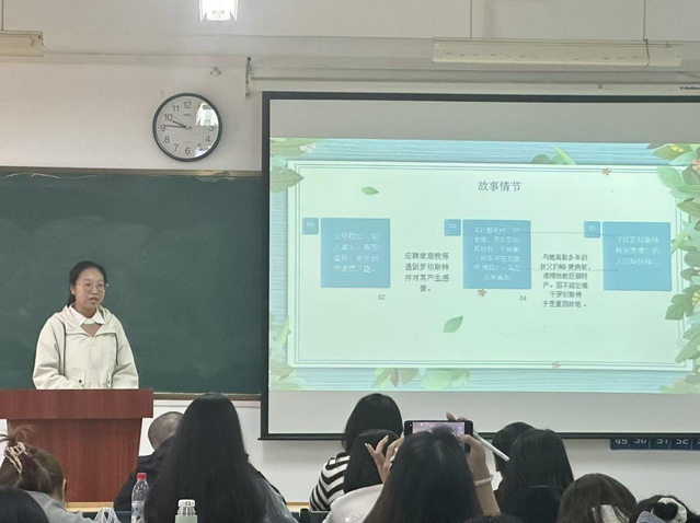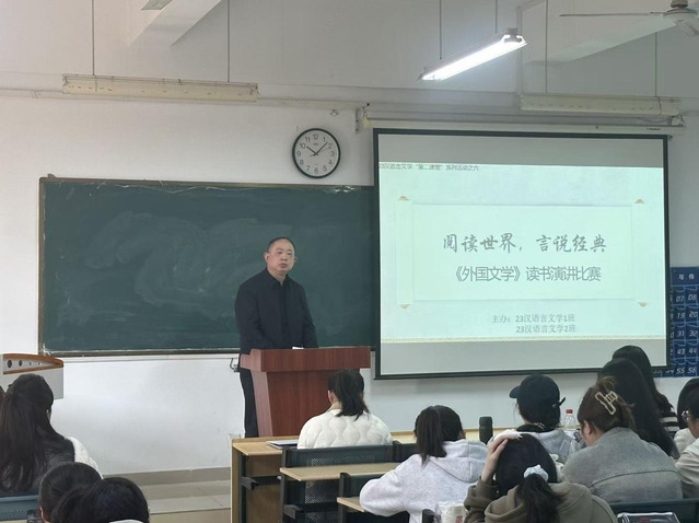 2025年11月14日上午,为激发学生课外阅读热情,提升人文素养与跨文化理解能力,合肥大学文化与旅游学院23汉语言文学专业1班和2班于南区5-305教室成功举办了以“阅读世界,言说经典”为主题的《外国文学》读书演讲比赛。