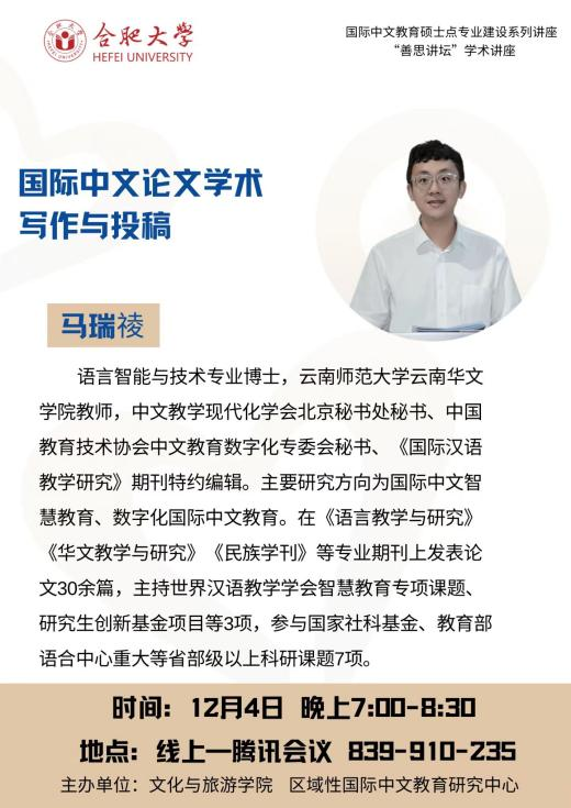 2025年12月4日晚19:00,合肥大学文化与旅游学院国际中文教育专业硕士点成功举办“国际中文论文学术写作与投稿”线上专题讲座。讲座特邀云南师范大学云南华文学院讲师、《国际汉语教学研究》期刊特约编辑马瑞祾老师主讲。硕士点全体师生,以及来自其他高校的近60名师生共同在线参与。