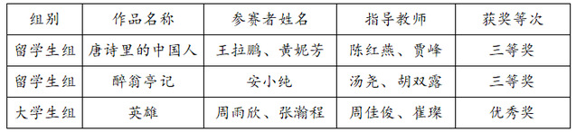 我院国际中文教育专业教师指导的作品,凭借扎实的语言功底、深刻的文化理解、出色的艺术表现,赢得了评委的一致认可,其中,《唐诗里的中国人》《醉翁亭记》获得留学生组三等奖,《英雄》获大学生组优秀奖。