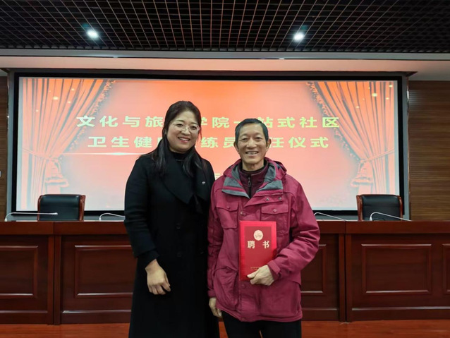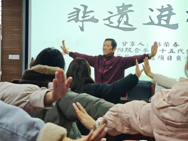 12月5日下午,合肥大学文化与旅游学院“一站式社区体育卫生健康系列活动——非遗进校园”在一区博学楼C座报告厅举行。活动由文化与旅游学院学工办副主任董敏主持,院长查金萍、院党委副书记张爱萍、阴阳双合拳第十五代传人韩荣春、优秀校友孙荣景及中国科学技术大学教师余年琴等嘉宾出席。