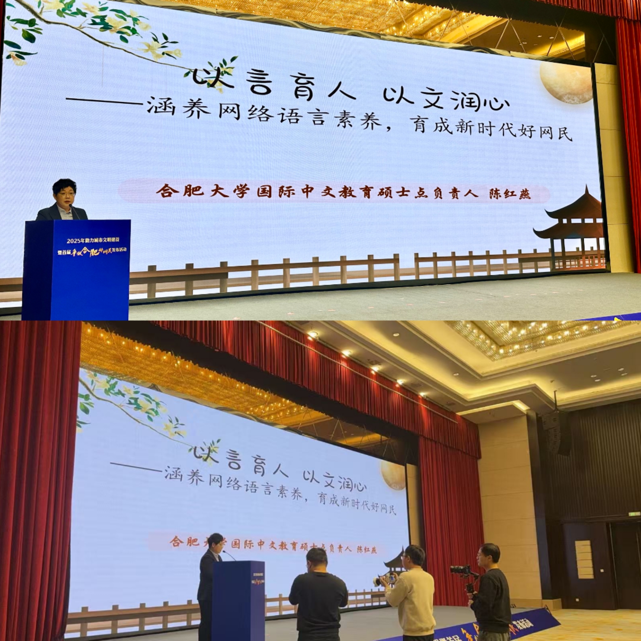 2025年12月16日上午,由中共合肥市委网络安全和信息化委员会办公室联合市委宣传部、市委社会工作部主办的2025年助力城市文明建设暨首届“争做合肥好网民”发布活动在泓瑞金陵大酒店三楼泓瑞厅隆重举行。合肥大学文化与旅游学院副教授、国际中文教育硕士点负责人陈红燕受邀作为嘉宾,发表“以言育人 以文润心——涵养网络语言素养,育成新时代好网民”主题演讲,分享合肥大学文旅学院在语言教育与网络文明建设领域的举措与成果。