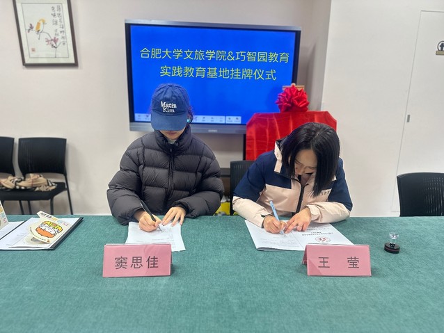 12月17日上午,合肥大学文化与旅游学院(以下简称“文旅学院”)与巧智园教育中心共建大学生社会实践教育基地挂牌仪式在巧智园教育中心圆满举行。合肥大学科研处副处长殷明明、文旅学院党委副书记张爱萍、团委负责人窦思佳,巧智园教育中心园长许琳、教学总监王莹出席仪式。