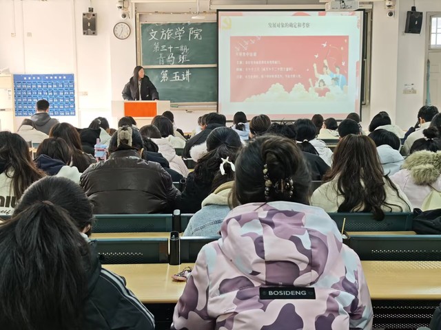 12月17日中午12:15,合肥大学文化与旅游学院第三十一期青马工程培训班第五讲在一区善思楼C座101教室开讲。本次培训特邀文化与旅游学院优秀学生代表2022级旅游管理专业孟雪琴担任主讲人,全体青马班学员怀揣着对入党流程的求知热忱与对理想信念的执着追求,准时到场参训。