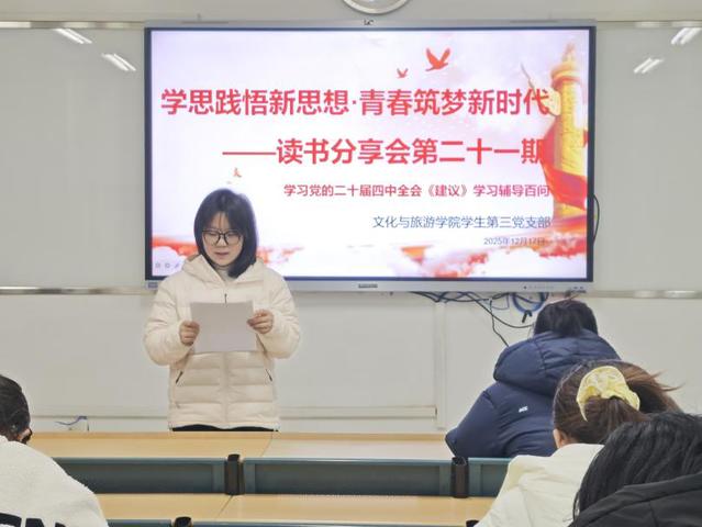 为深入学习贯彻党的二十届四中全会精神,推动科技创新理念与文旅专业实践深度融合,12月17日,文化与旅游学院学生第三党支部成功举办第二十一期专题读书分享会。会上,三位入党积极分子结合专业所学与实践经历分享心得体会,展现了科技创新理论与文旅实践的紧密联系。