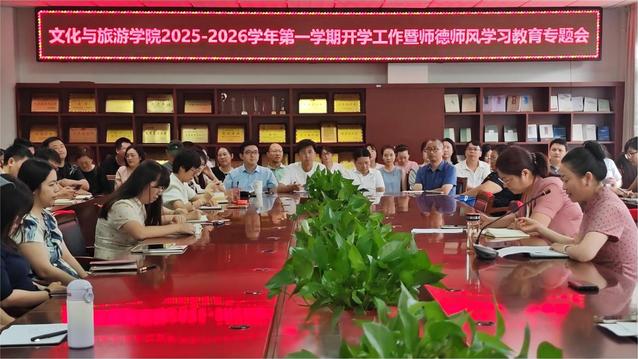 2025年9月2日下午,合肥大学文化与旅游学院在教学楼会议室召开2025-2026学年第一学期开学工作会议暨师德师风学习教育专题会。会议旨在布置安排新学期各项工作,将师德师风建设作为开学“第一课”,引导全体教职工以昂扬的精神风貌投入到教学科研工作中。学院党政领导班子及全体教职工参加会议。