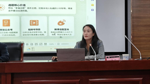 讲座围绕合肥日报与合肥大学文化与旅游学院的共创合作展开,聚焦校媒联动的创意落脚点。束芳主任结合媒体一线实战经验,拆解了主流新媒体平台的创作逻辑。她用八大校园爆款案例,讲解选题“金三角”原则,教会学生怎么找选题、做内容,进行跨平台传播,并特别提醒选题禁区,教育学生守住创作底线。现场还发布了“合报新青年”共创计划,为同学们提供现金奖励、一对一指导、流量扶持、署名发布等实打实的支持,帮助校园作品出圈变现。