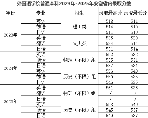 外国语学院普通本科2023年-2025年安徽省内录取分数