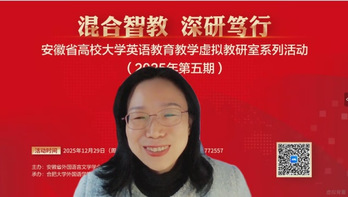 为深入推进AI智能辅助教学背景下的大学英语教学改革,探索英语教育与人才培养深度融合新路径,由安徽省外国语言文学学会大学英语教学研究分会主办,合肥大学外国语学院、安徽信息工程学院通识教育与外国语学院共同承办的安徽省高校大学英语教育教学虚拟教研室系列活动(2025年第五期)于12月29日下午2点30分在线上隆重举行。本期活动主题为“混合智教 深研笃行”,旨在通过跨校研讨,共享智慧共谋发展。