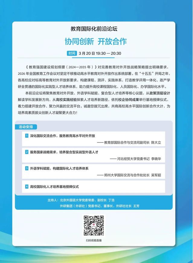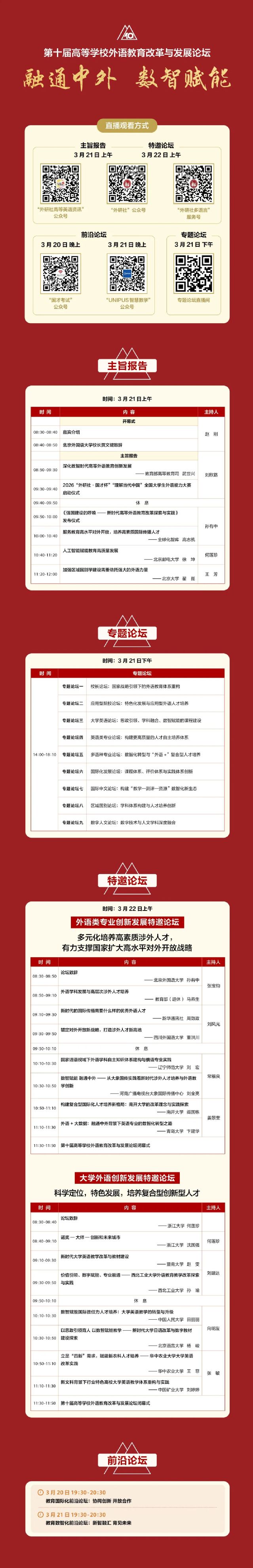 十年为序,再启新程。第十届高等学校外语教育改革与发展论坛即将于2026年3月20—22日在北京举办,本届论坛主题为“融通中外,数智赋能”。论坛设置主旨报告、特邀论坛、专题论坛,特别设置前沿论坛,并全程线上直播。专题网页为汇聚论坛智慧成果、方便广大教师观看直播,外研社特别推出第十届高等学校外语教育改革与发展论坛专题网页,汇总主旨报告、特邀论坛、专题论坛与前沿论坛直播间,一站式获取论坛最新动态,启迪新思,共促发展。识别二维码,进入专题网页