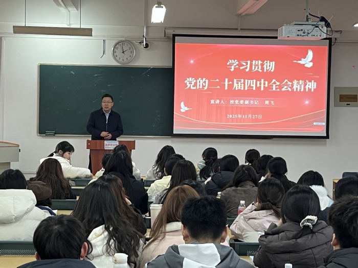 2025年11月27日,校党委副书记周飞为2025级汉语言专业学生授课,他从重大意义、核心要义、实践要求等维度解读党的二十届四中全会精神,结合“激发全民族文化创新创造活力”战略部署与专业特性,阐释“高质量发展”“科技自立自强”等关键词背后的中国式现代化内涵,鼓励学生立足专业传承中华优秀传统文化,在文化创新、乡村振兴等领域主动作为。