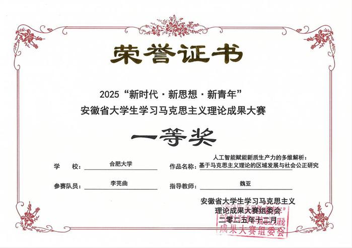 本次大赛由安徽省教育厅主办,旨在推动马克思主义理论在高校学生中的学习、传播与应用,鼓励青年学生结合时代课题开展理论研究和实践探索。我校高度重视此项赛事,精心组织、系统推进,紧密结合新时代发展实际,聚焦人工智能与新质生产力、数智时代思想政治教育、科技自强、区域经济、基层治理等前沿议题,开展扎实的理论研究和实地调研,形成了具有较强理论深度与现实意义的学术与实践成果。 此次成绩的取得,是我校高质量实施新时代立德树人工程,推进省级立德树人机制综合改革试点单位建设的重要举措,也是我校思想政治理论课教学改革与创新人才培养成果的一次集中展示。学校将继续总结参赛经验,加强对学生理论学习和实践创新的指导,推动马克思主义理论教育与学生成长、时代发展深度融合,为培养更多具有坚定理想信念、扎实理论素养和强烈社会责任感的时代新人作出更大贡献。 来源:马克思主义学院 编辑:张惠琳 预审:鲁先瑾 审核:贾峰 |