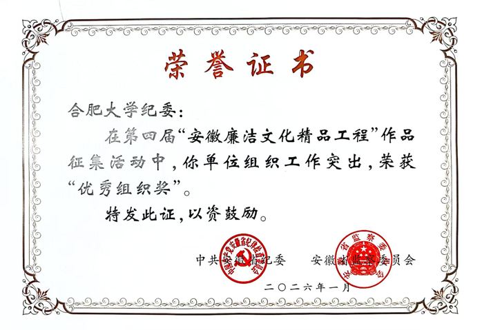 近日,在第四届“安徽廉洁文化精品工程”作品征集活动中,我校纪委因组织工作扎实、成效显著,被中共安徽省纪委、安徽省监察委员会授予“优秀组织奖”。