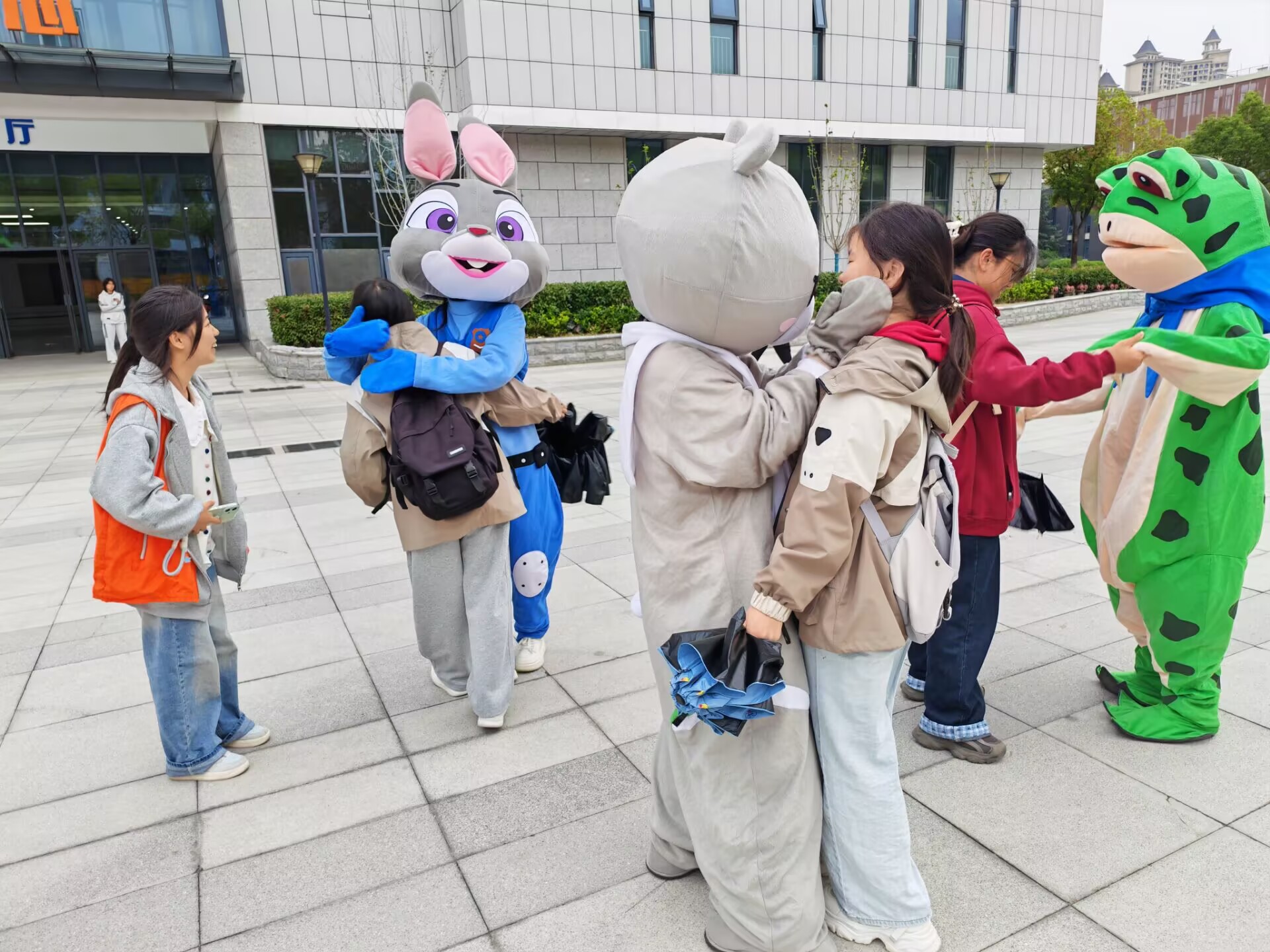 活动现场有2名志愿者负责引导队伍,并准备了定制小礼品。4名身着可爱玩偶服的志愿者早早到位,憨态可掬的造型刚一亮相便吸引了过往同学的目光。他们主动张开双臂,为大家送上治愈的拥抱,并配合拍照,用肢体语言传递关怀。温暖的氛围吸引同学和老师们驻足停留,在镜头前记录下温馨瞬间。“不用复杂流程,一个拥抱就能收获快乐,特别治愈。”现场参与活动的同学表示,这样的活动既缓解了日常学习压力,也让校园氛围更加元气暖心。