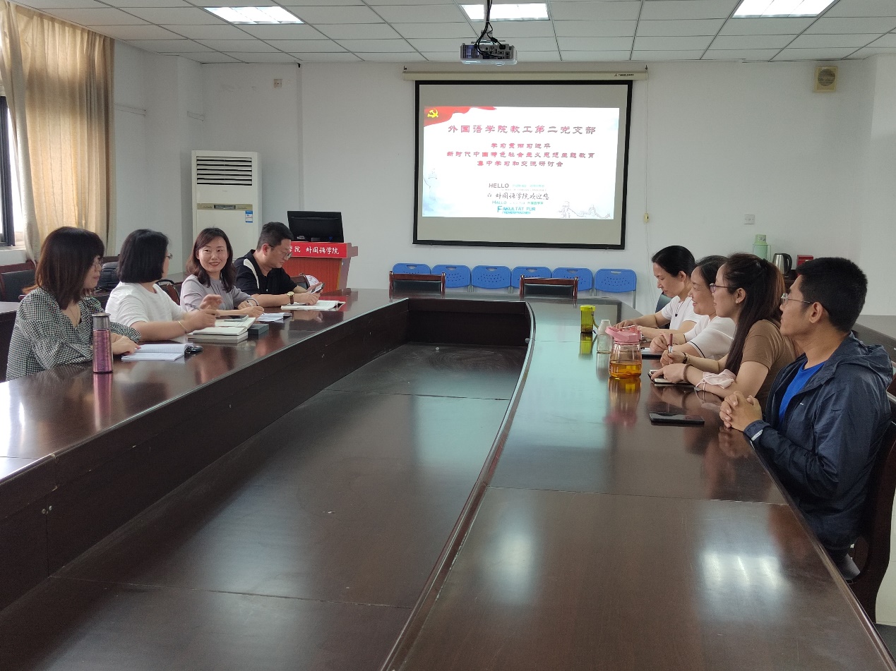 为深入开展学习贯彻习近平新时代中国特色社会主义思想主题教育,牢牢把握“学思想、强党性、重实践、建新功”的总要求,6月7日下午,外国语学院教工第二党支部在院三楼会议室召开集中学习及交流研讨会。会议由支部书记徐天戍主持,院党委统战委员、副院长李洁参加会议。