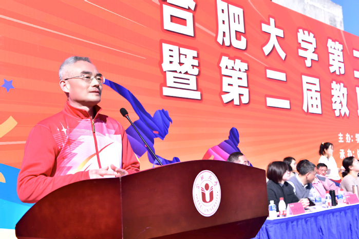 任永致开幕词。他指出,体育是“五育”并举全面发展的关键一环,更是立德树人根本任务的重要载体。学校坚持把体育教育融入人才培养全过程,持续推进体育俱乐部制改革,改革实践两次荣获安徽省教学成果一等奖,学生在国内国际多个体育赛事中不断取得优异成绩,校园内形成了热爱体育、参与运动的浓厚氛围。他希望全体运动员发扬顽强拼博的精神,勇于超越自我,敢于挑战强者,尊重规则、尊重对手,赛出风格、赛出水平;希望全体裁判员恪尽职守,公正裁决,维护赛场的公平与秩序;希望全体师生把赛场上的拼搏精神、团队意识与竞争品格,转化为“实”字当头、“干”字为先的实际行动,为学校的高质量发展注入更强劲的动能。