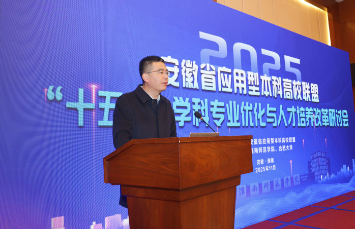 11月26日,由安徽省应用型本科高校联盟主办、淮南师范学院、合肥大学承办的安徽省应用型本科高校联盟“‘十五五’学科专业优化与人才培养改革”研讨会在淮南举行。联盟常任主席单位合肥大学党委副书记、校长任永,联盟轮值主席单位淮南师范学院党委副书记、院长程刚出席会议。联盟成员高校分管副校长、教务处等相关领域负责人以及联盟秘书处人员共计近百人共聚一堂,共谋安徽省应用型高校人才培养新篇章。