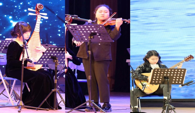 音乐分为“水墨弦歌·国风雅集”“声色万象·潮流集结”“山河颂歌·华章共享”三大篇章,内容丰富、层次分明。开篇大学生艺术团器乐队合奏《红楼梦·序曲》,古典旋律婉转悠扬,勾勒出雅致国风意境;随后《植物大战僵尸》合奏节奏明快、活力迸发,瞬间点燃全场氛围;最后激昂欢快的《新年好》合奏奏响,为音乐会画上圆满句号。