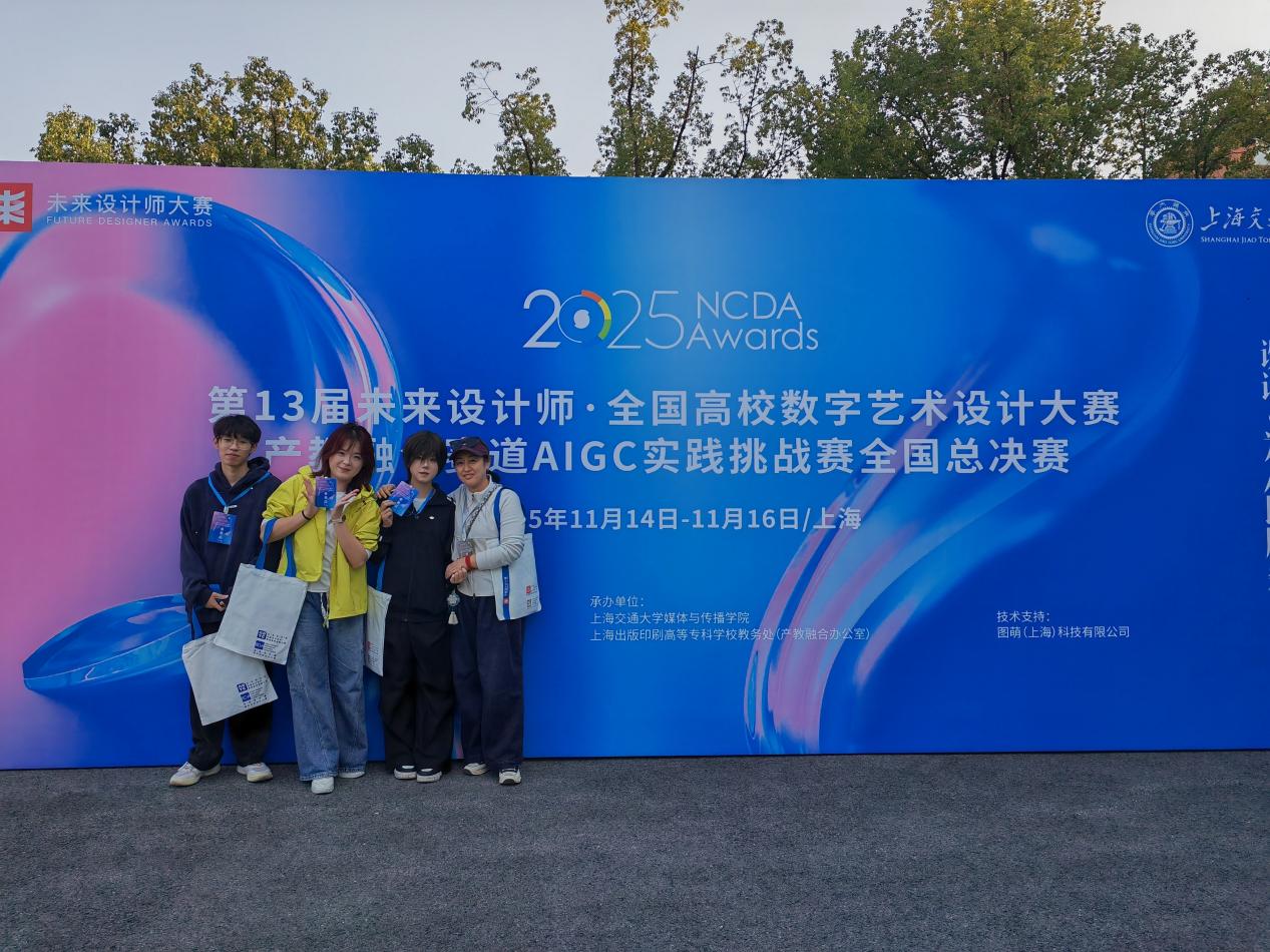在2025年11月16日于上海交大落幕的2025第13届未来设计师·全国高校数字艺术设计大赛(NCDA)国家级产教融合赛道—AIGC实践挑战赛主题实践大赛全国总决赛中,我校设计学院王莹莹、罗沁雪、温尼西同学在石林老师的指导带领下,凭借出色的技术实现与文化表达能力,从全国146支参赛队伍中脱颖而出,荣获全国二等奖。
