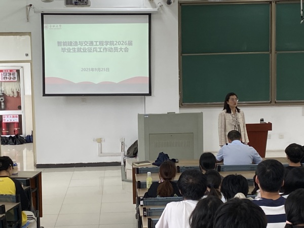 2025年9月25日中午,智能建造与交通工程学院在41栋3阶梯召开了2026届毕业生就业征兵工作动员大会。智建学院党委书记张永军、院长祝磊、副书记高乔楠、毕业班辅导员和2026届毕业生参加了会议。