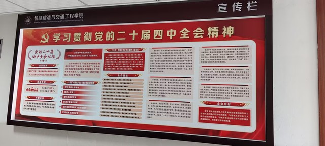 智建学院党委同时在学院网页设置滚动浮窗、在学院三楼宣传栏布置《党的二十届四中全会公报》主要内容的展板,做好党的二十届四中全会精神的宣传工作。(图)(智能建造与交通工程学院 撰稿人:王艳丽 一审:刘艳双 二审:高乔楠 三审:张永军)