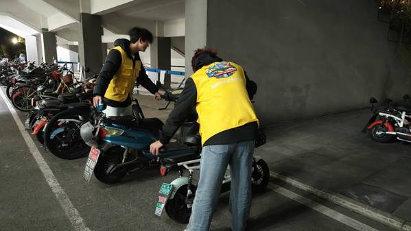在停车区域,志愿者们对非机动车进行了规范整理,将停放不当的车辆统一归置至指定区域,确保了车辆“入位、顺向、整齐”,使停车秩序与校园面貌焕然一新。