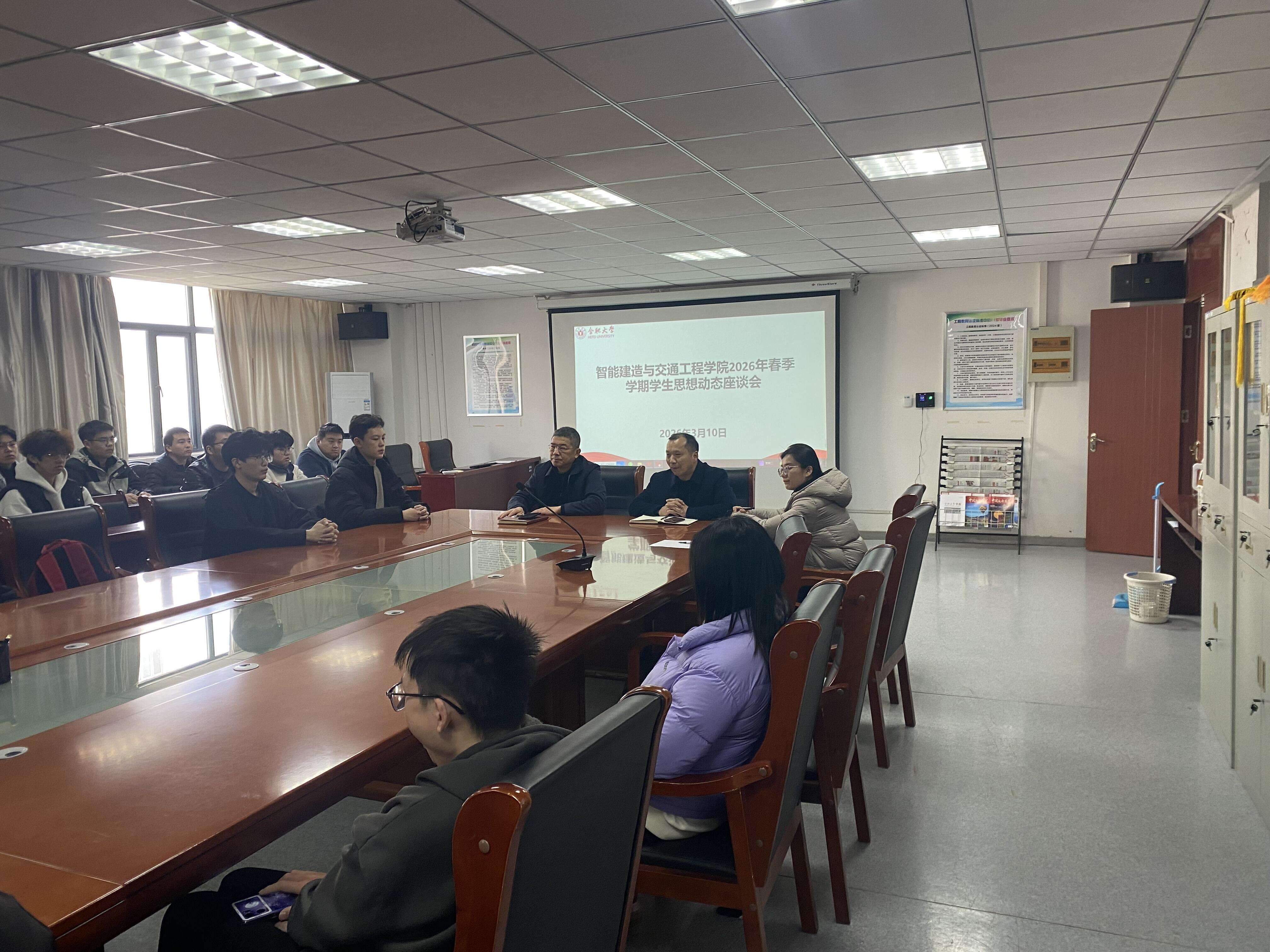 为精准把握学生思想动态,切实做好学生教育管理与服务工作,2026年3月10日中午,智能建造与交通工程学院于41栋305会议室召开了2026年春季学期学生思想动态座谈会。学院党委书记张永军、院长祝磊、党委副书记高乔楠、学工办主任董波出席会议,全院各班团支书、班长参会交流。